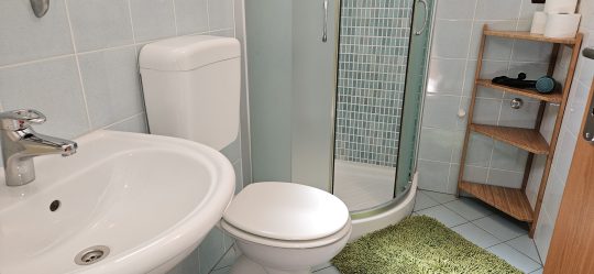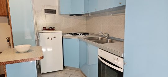 Die Wohnung verfügt über eine geräumige Küche (Kühlschrank mit Gefrierfach, Backofen), ein Badezimmer (Dusche/WC, Haartrockner) und einen leicht abgetrennten Schlafbereich mit einem 140x200cm großen Doppelbett.