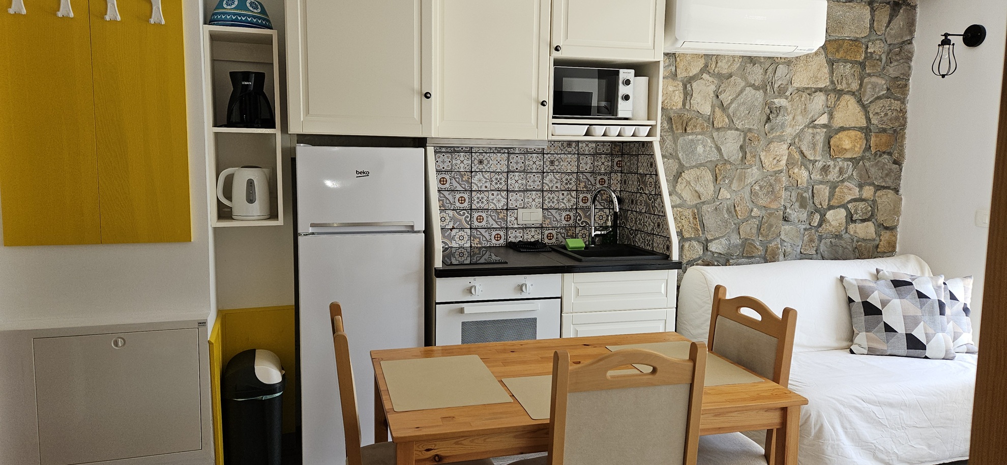 Voll ausgestattete Küchenzeile mit Essecke (Mikrowelle, Kühlschrank, Wasserkocher und Kaffeemaschine), Bad (Badewanne/Dusche und WC/Bidet) und geräumiger, möblierter Balkon