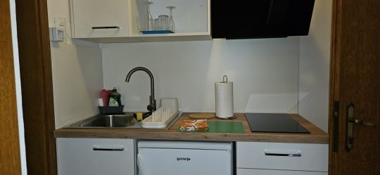 Zimmer von 15m2, auf der 1. Etage hat: kleinen Flur mit Küche, Schlafbereich mit Doppelbett und 2 x Einzelbett, Tisch und Stuhl, Bad (Dusche, Waschbecken, WC).