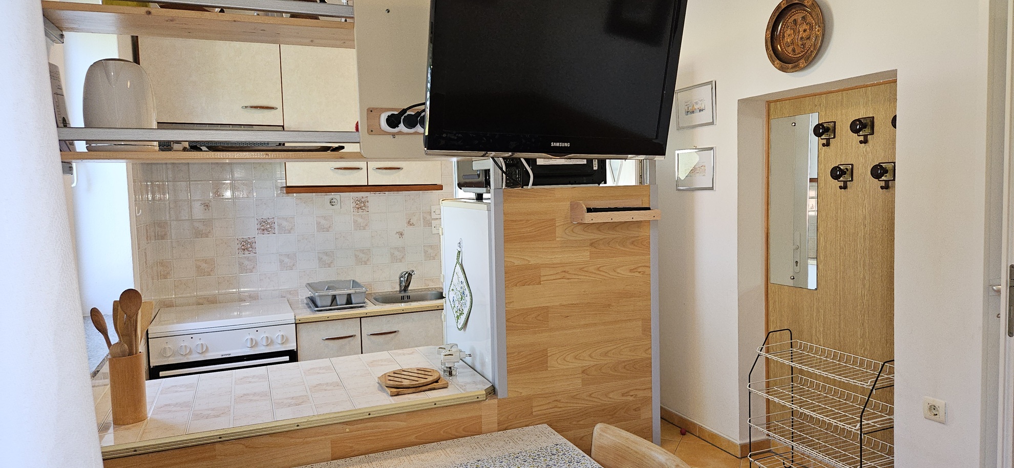 Stanovanje 38 m2 ima ločeno spalnico (enojni postelji z možnostjo razdelitve), dnevno bivalno kuhinjo (hladilnik z zamrzovalnikom, mikrovalovna in toaster) z dodatnim raztegljivim ležiščem dimenzije 145×200 cm za največ dve osebi ter kopalnico (sušilec za lase), pralni stroj.