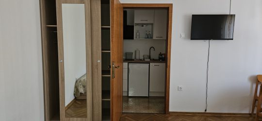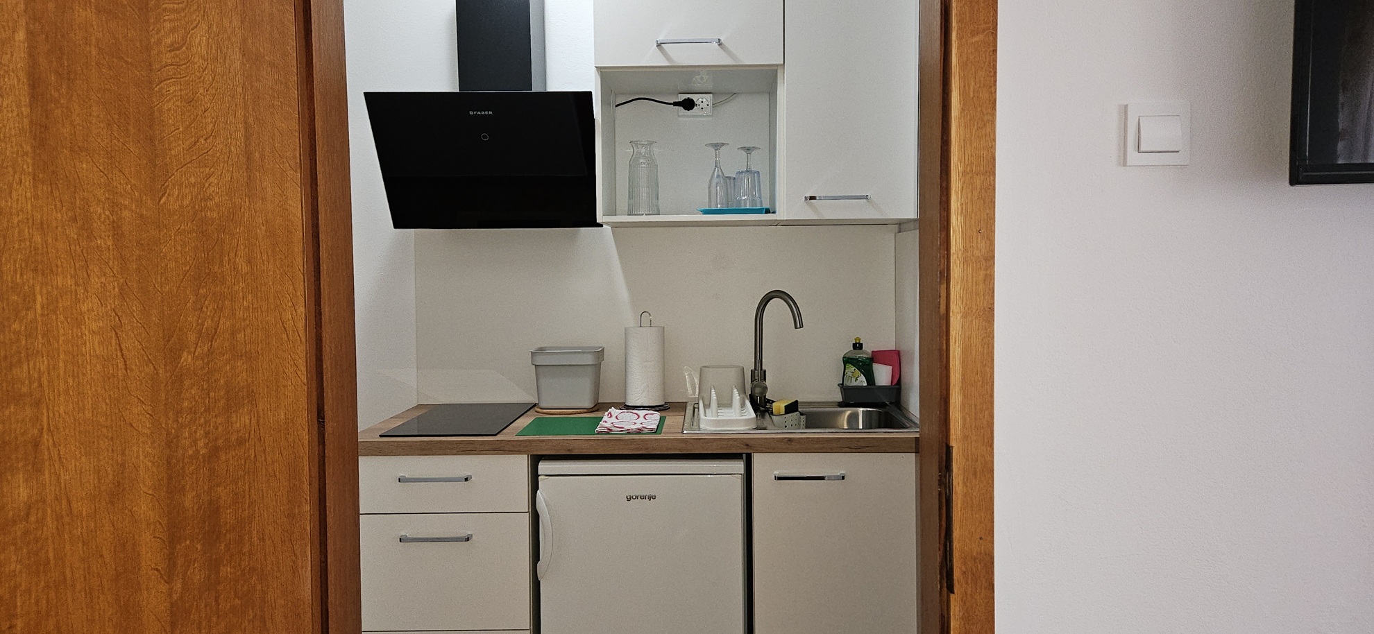 Klimatizirana soba je osnovno opremljena, predprostor z manjšo kuhinjsko nišo ter z lastno kopalnico (tuš/wc).